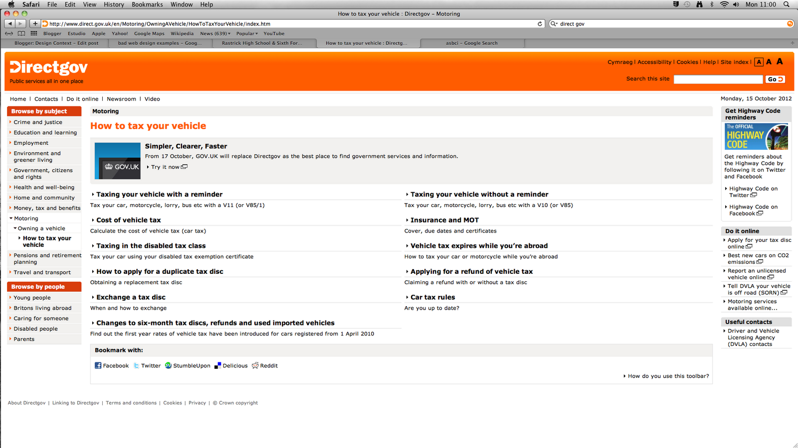 The direct gov website works for it purpose, it has a lot of information which is first thing you see when you first get onto the website, but it is a lot and is overpowering as you don't know where to look or what to do when you first see it. The navigation is good and easy to use. The navigation through the pages aren't so easy and are confusing which to click on for which page to access etc. The website could have a better structure which would manage the vast amount of information better and make it easier to read and understand. With the navigation maybe it be within the main navigation and just be split down into smaller categories instead of in the main page amongst the information. Slight improvements will make this easier to use and navigate around, making the experience much better.